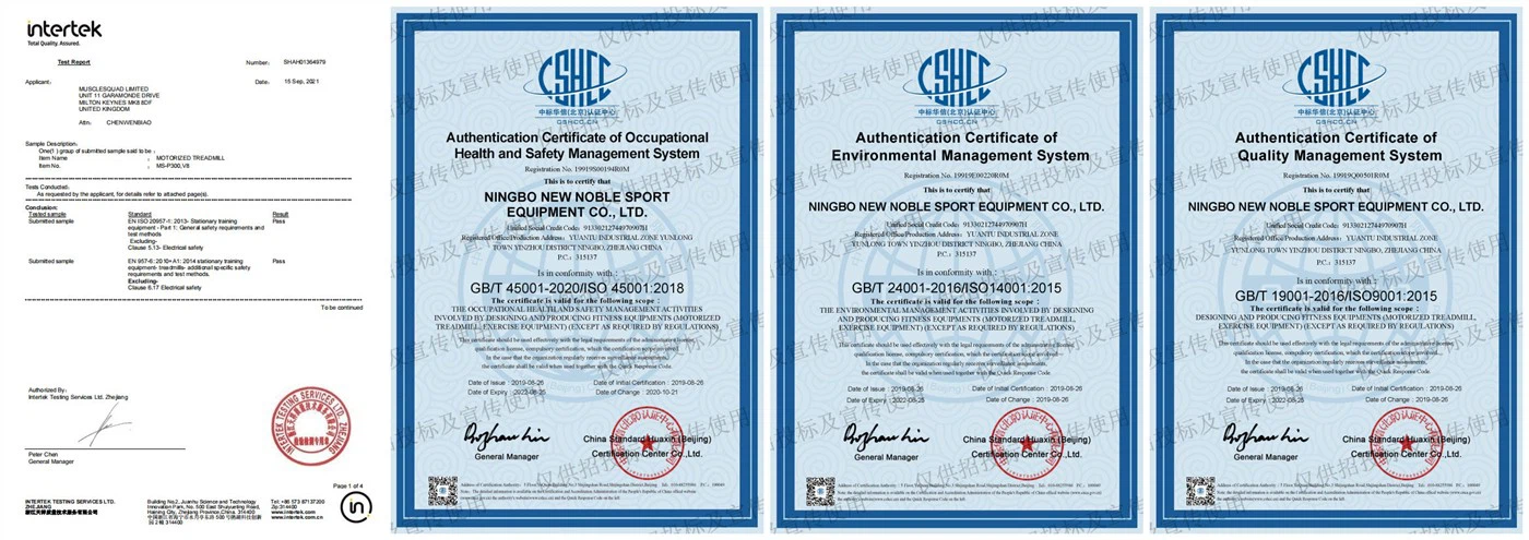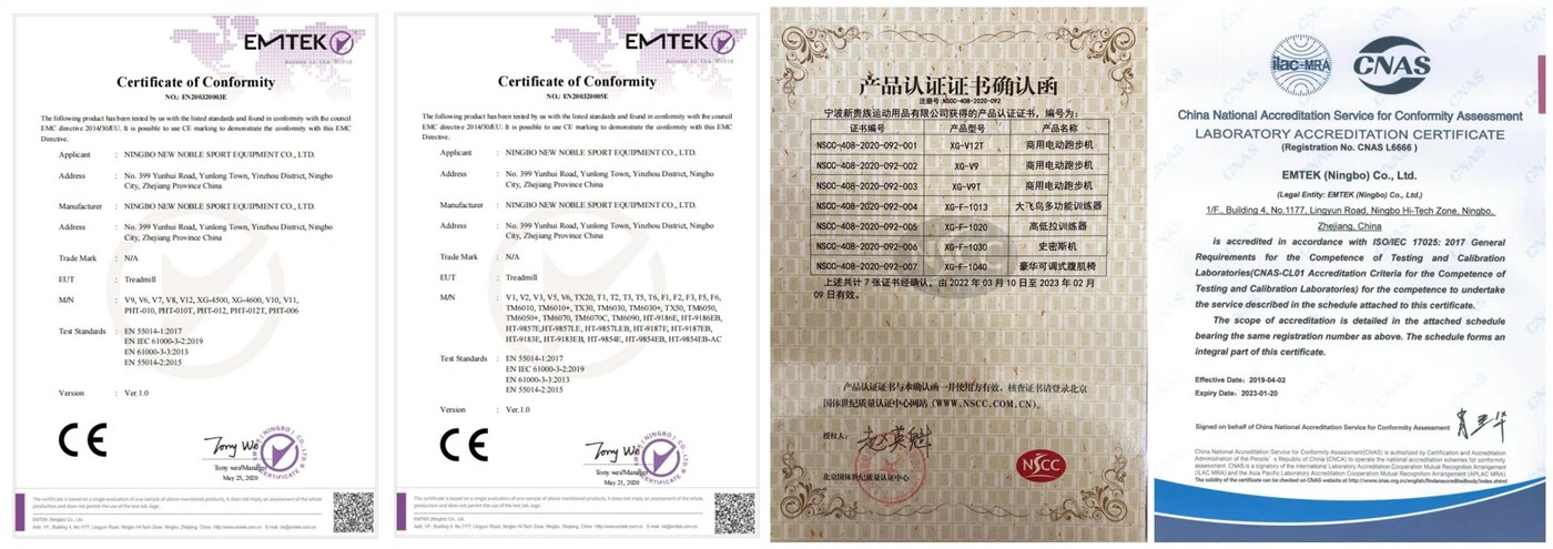 CE, ROHS, EN957, CNAS, ISO 9001, ISO 14001, OHSAS 18001, NSCC.